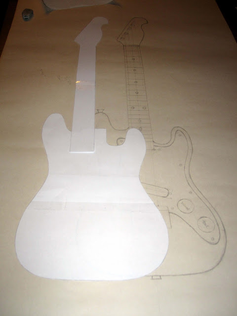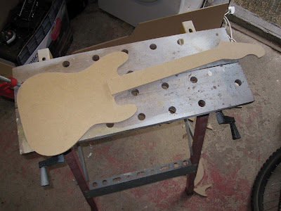 | My intention all along was to use my new router to cut the body. So here you see me cutting patterns for the neck and body. I’ve been stupid and simply glued the paper (backwards) to the 6mm MDF with Pritt Stick. |