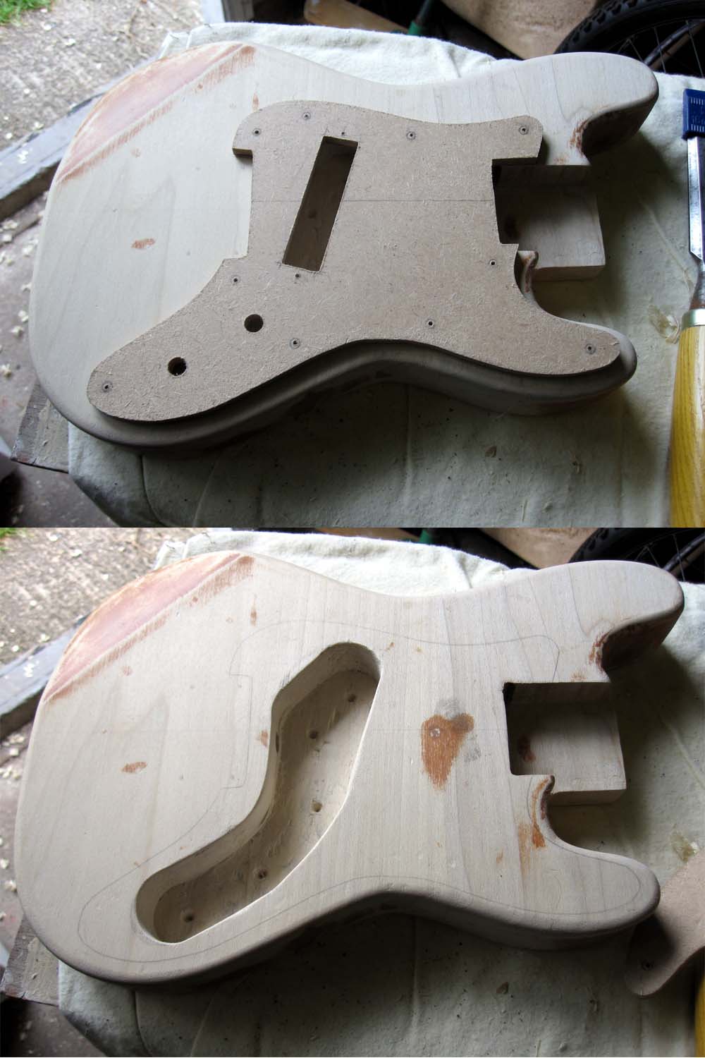 I’m almost there now with the body. Next I’ll be painting it, but not before I’ve got the neck sorted. I’ve been busy here also, but I’ll save this for my next post. I still haven’t plucked up the courage to fit the frets… I’m getting closer by the day…