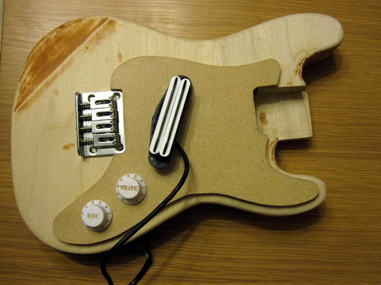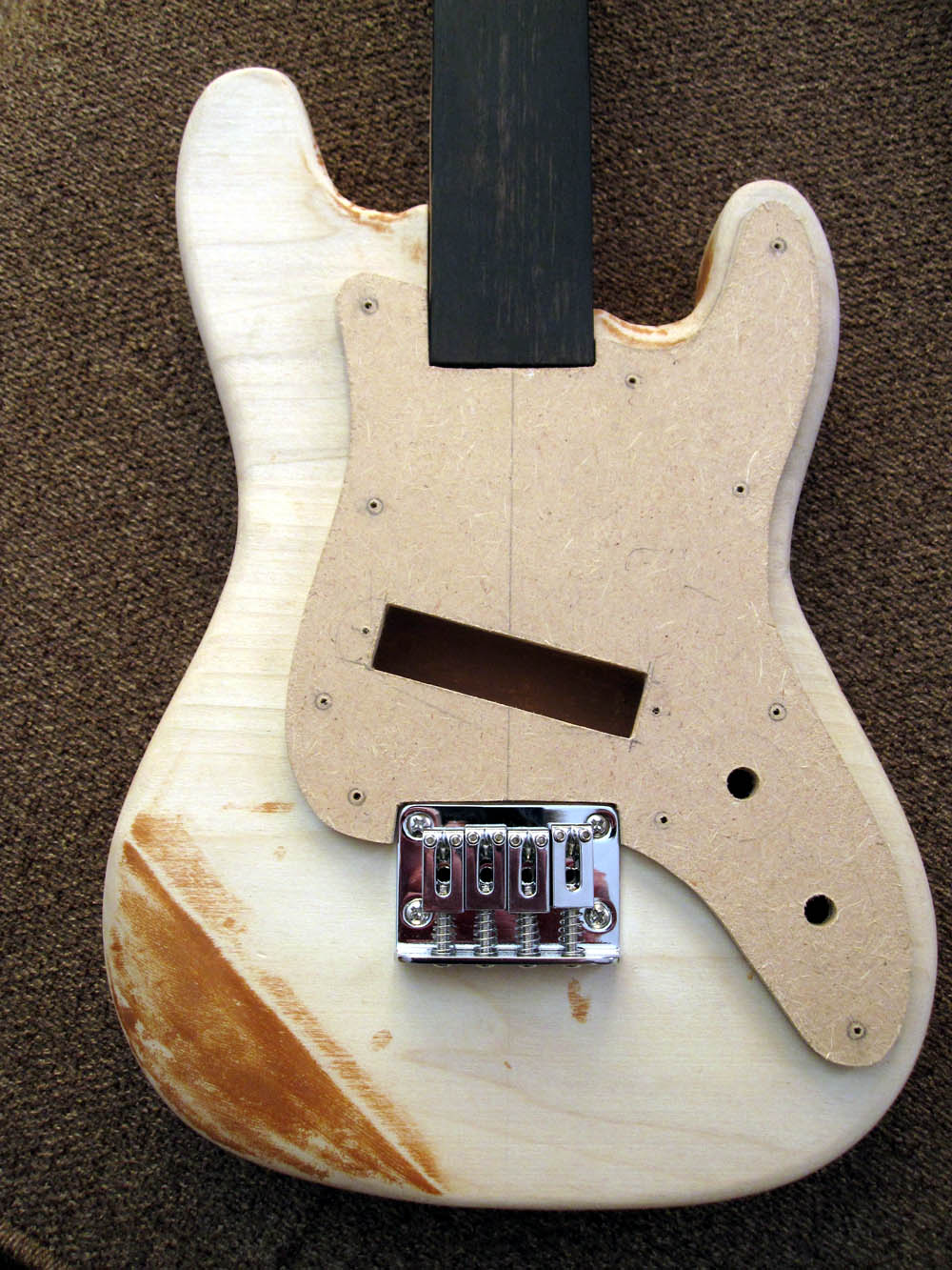 | And here’s where I’m up to at the moment. The neck is screwed in place, along with the bridge. You see that the pick guard still fits! Yep, that’s me measuring twice again! |