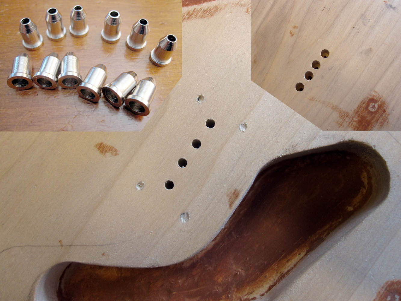 | You will remember that I was lucky enough to be given a Strat-style bridge custom made for a ukulele by Julian Davies. In hindsight, this was probably the best thing that could have happened to me in terms of getting this build right. I’ve been using it to help me to get my measurements correct. It’s been a good baseline. One thing that puzzled me for a long time was how I was meant to fit the strings. Thankfully Daniel Hulbert came to the rescue! He revealed to me the existence of ‘ferrules’. Twelve are pictured in the picture – but I’ll only be using four. They will fit into the back of the body and this is where the strings will be threaded through from the back up out of the holes in the bridge and up to the neck. I found getting these holes right really difficult. I marked the holes on the front and drilled through to the back. Even though I used my drill stand, they didn’t go through straight. It’s hard to tell in the photo, but I widened the holes at the back to allow the ferrules to fit and this allowed me a chance to correct some of the alignment problems, but you can see that I didn’t get it 100% right. The holes in the middle of the picture are of the front and the top right shows the back. |