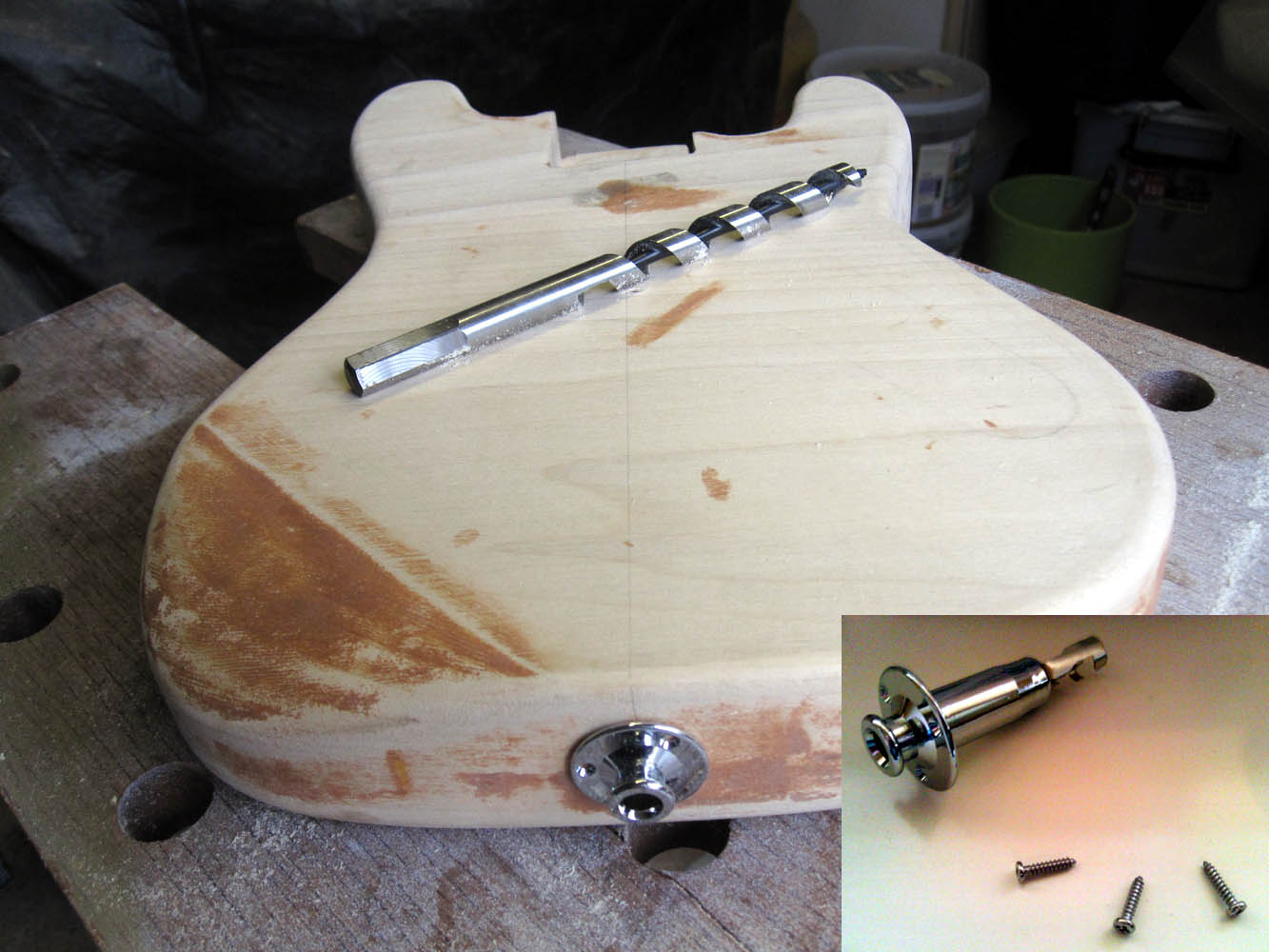 | Pretend you can’t see the cavity for the electrics in the picture above. I didn’t do that next. What I did next was to attach the neck to the body. I wanted a square plate, but couldn’t find any made specifically for the purpose that would fit. Instead I repurposed a flat Les Paul jack plate. See the hole in the centre for the jack. I milled the screw holes wider and fitted it with the shortest guitar Strat screws I could find. FYI, other homeuke-builders like Daniel Hulbert are using oval guitar jack sockets to fit smaller scale electric uke necks. |