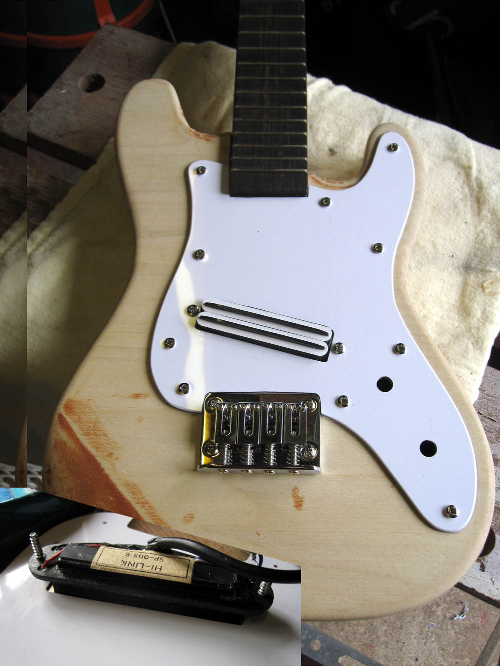And here’s the scratch plate with the pickup fitted for size. It fits! Next I screwed the