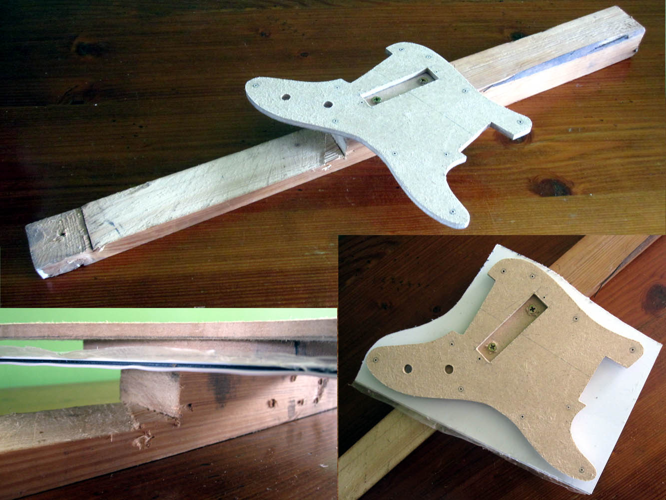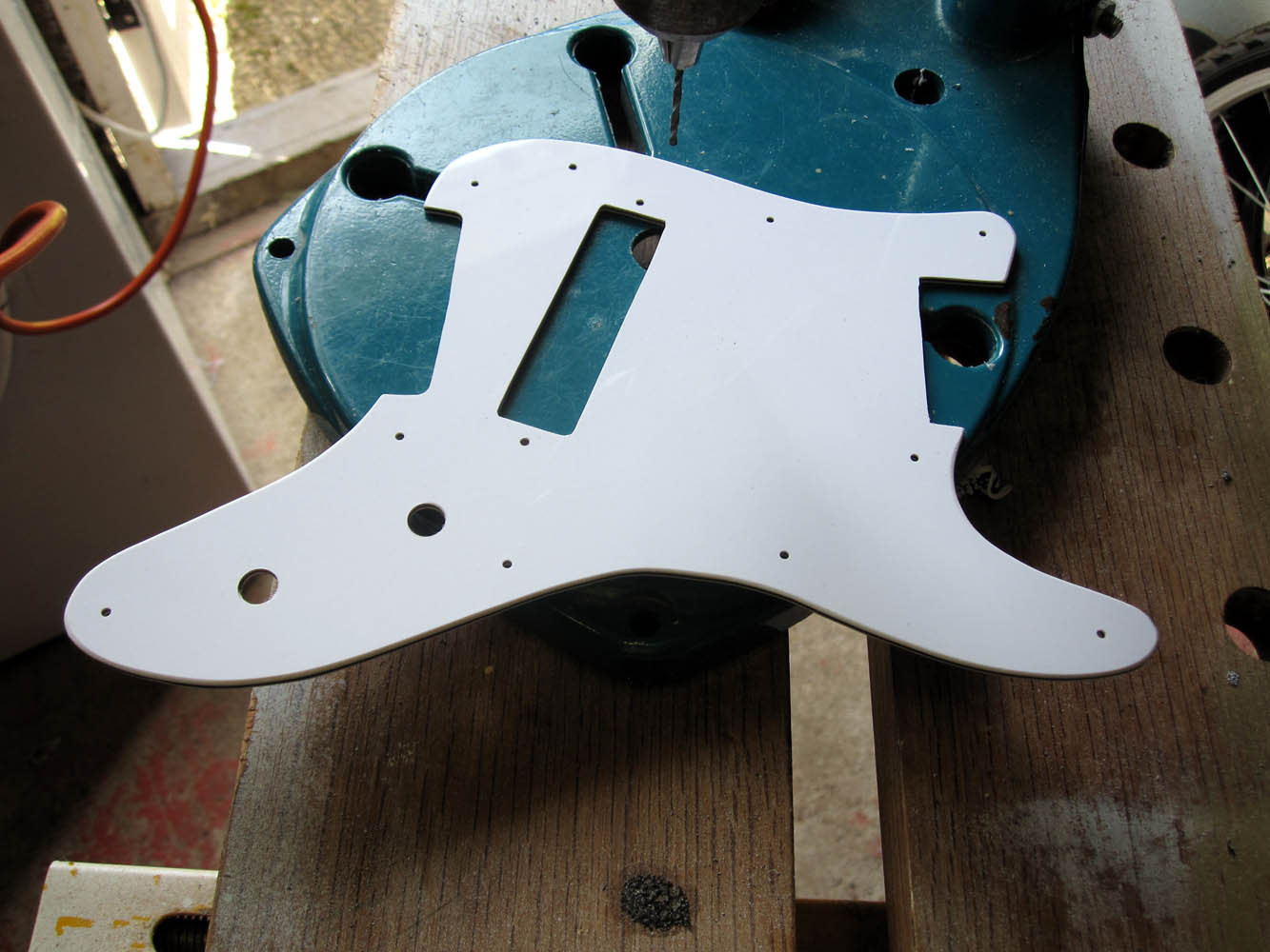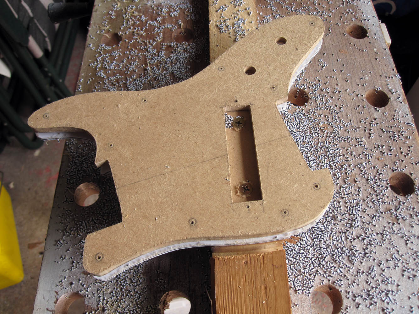 Here’s the scratch plate resting on the body. I’ve filed and smoothed to