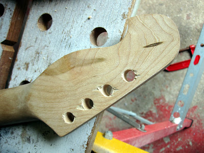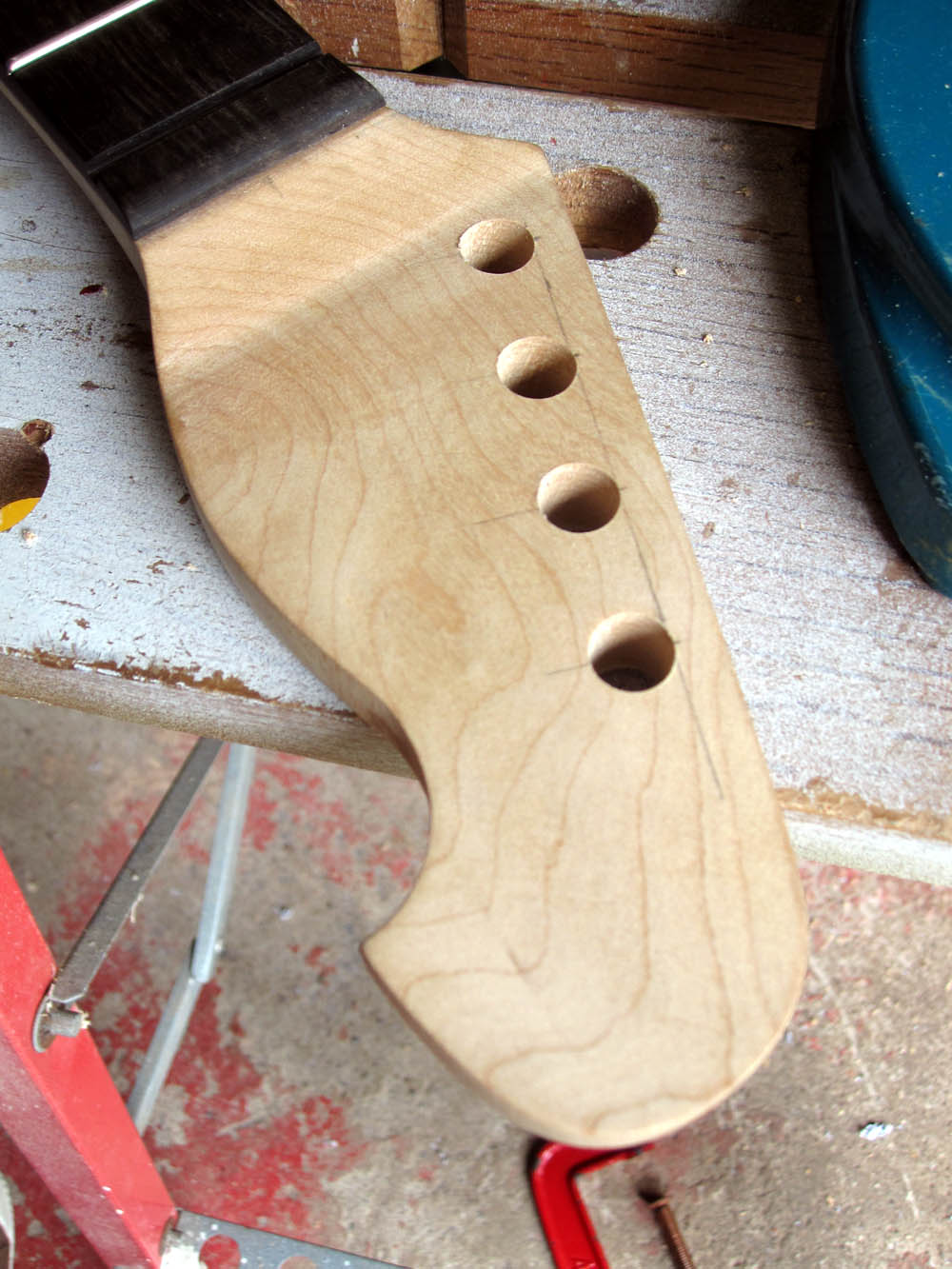 | Referring back to my master pattern I marked on the head where I wanted the tuners to go. I’m trying to be really precise with where they go and I haven’t left myself much room at all to maneuver. I wanted them as close together as possible, but I’ve also tried to line it up so that the strings will be in line with the nut grooves as much as possible. I know I’m being picky, but I reckon it’s little details like this that will make all the difference. We’ll find out when I fit the strings! There were two things I was worrying about when I drilled these holes: The first was that I wouldn’t get them straight; the second was that I would splinter the wood. They’re fairly straight… as for the splinters… |