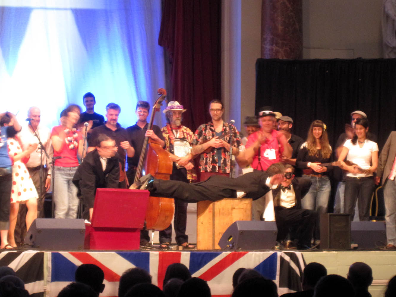| The Hot Potato Sycopators were brilliant and became a bit of a talking point in the King Uke family over the weekend. In fact, we’re still talking about them! I’m keen to track these guys down and catch them again. They played (pretty much) everything double-time and slotted in some great comedy to break things up a bit. Mr Dennis Teeth (in the middle) is quite the talent! This picture is from the end of the night. |