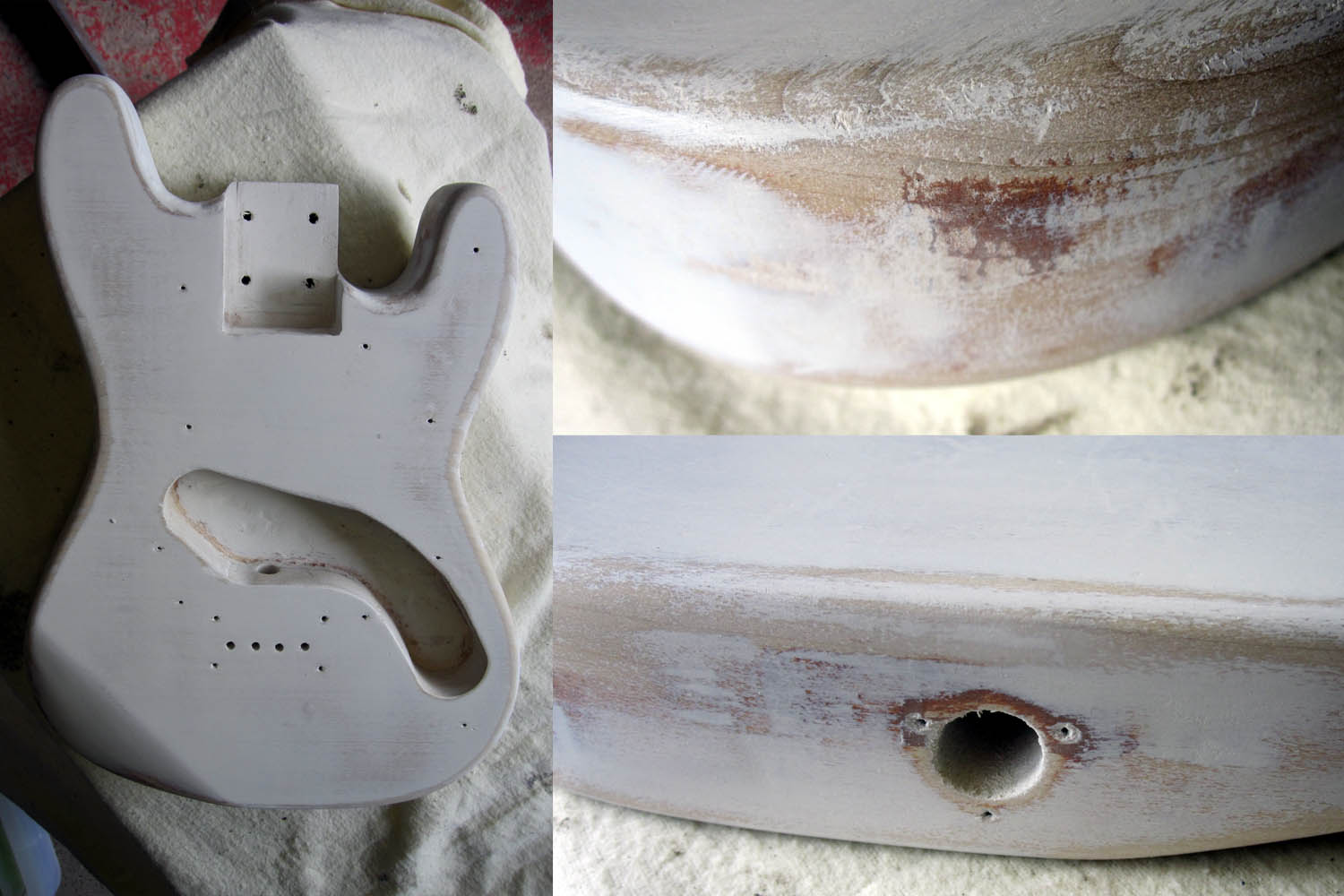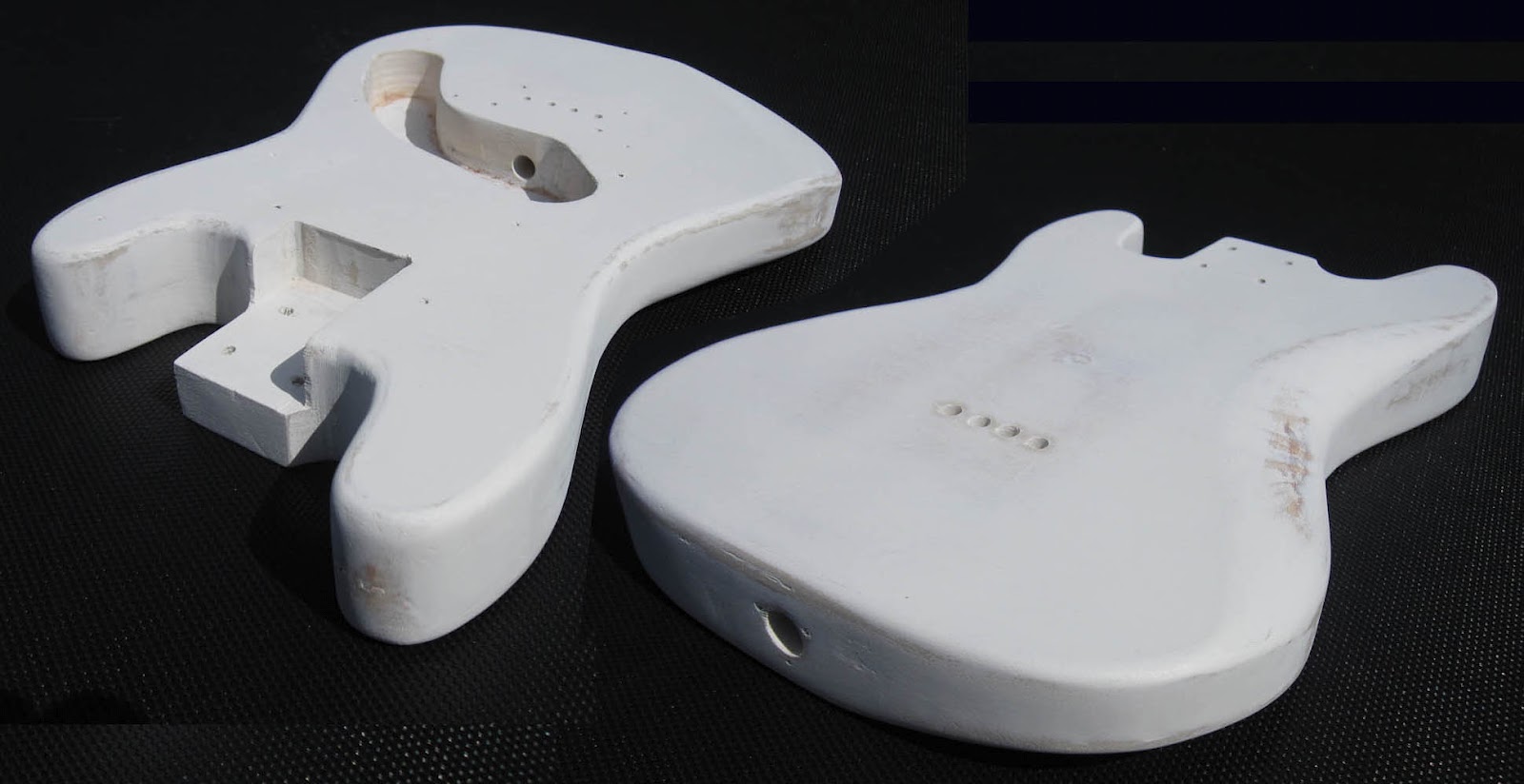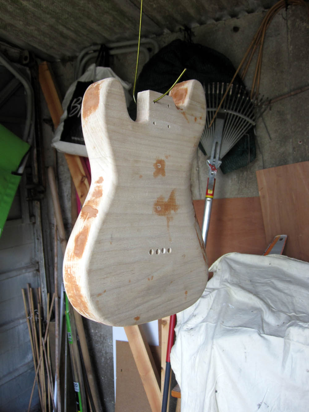 A lot done and more yet to do. I will sand this down smooth and hopefully, providing I’m not too rough with it, it will then be time to lacquer the body and neck. That’s my next post. Watch this space!