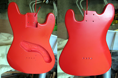 I’m not sure that I have the patience to be an expert painter. I’m not sure that I have a gentle enough touch to be an expert painter. In my last post I talked about some of the challenges I’ve been having painting the body of my electric ukulele. I’d had a bit of a nightmare with the undercoat, but things seemed to be looking up. I closed off having applied the red finish and having left the body to hang for 24 hours. Have you been wondering what happened next? Read on…