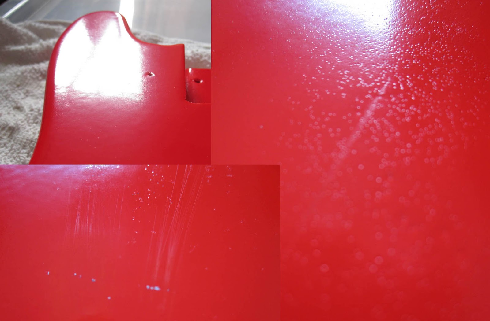 | Even before the paint had set things weren’t quite going according to plan. I mentioned the problems that I’d had with strange pin-prick holes in my last post. I’d resorted to some targeted spraying to try and remove and had ended up with runs. Having left the body to dry overnight the finish had vastly improved. There were still runs to deal with, but the finish was smooth with minimal orange-peel. I brought the body inside and lay it flat on a cardboard box while I played aroundwith the electrics. When I came back to it, it had stuck to the box! I pulled it off and there were marks in the paint! I rubbed them thinking that it was fluff and made it worse! What on earth was going on! In disgust, I wrapped the body in a towel and stewed for a week. Unwrapping it revealed that the towel had marked the surface. Can you believe that? There was an imprint of the pattern of the fabric. I don’t really know what went wrong. Perhaps I should have given it a lot longer to cure before handling it? With all the rain we’ve had, perhaps humidity had effected it? Perhaps I just used the wrong type of paint? I set to it with some sandpaper… |