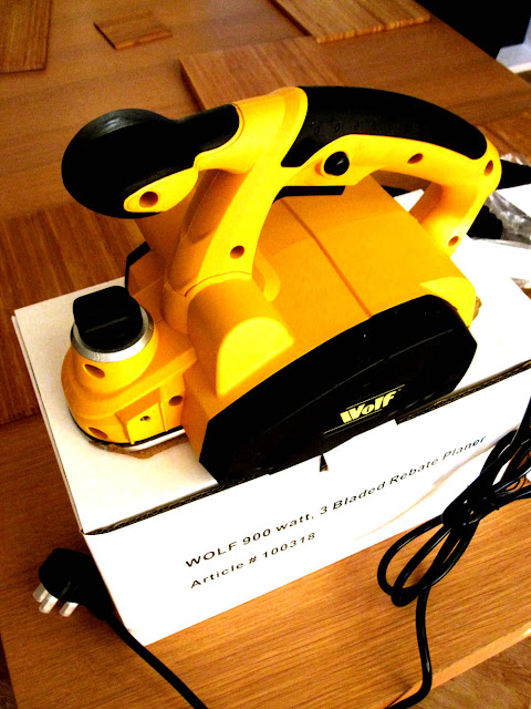 | I’ve leveled wood using a router before. This time I figured that I’d try out a different technique. Perhaps an electric planer would do the trick? Here’s what I bought… a Wolf 900 watt 3-bladed Rebate Planer. It’s huge! A big chunky monster! Would I be man enough to tame it? It was only when it had arrived that I started searching the internet for hints on how I might use it. Watching the videos I began to experience that same sinking feeling I got when I decided that I would learn how to plaster my living room wall. You don’t learn anything without giving it a go. On the plastering… it was a complete disaster… I won’t be trying that again. |