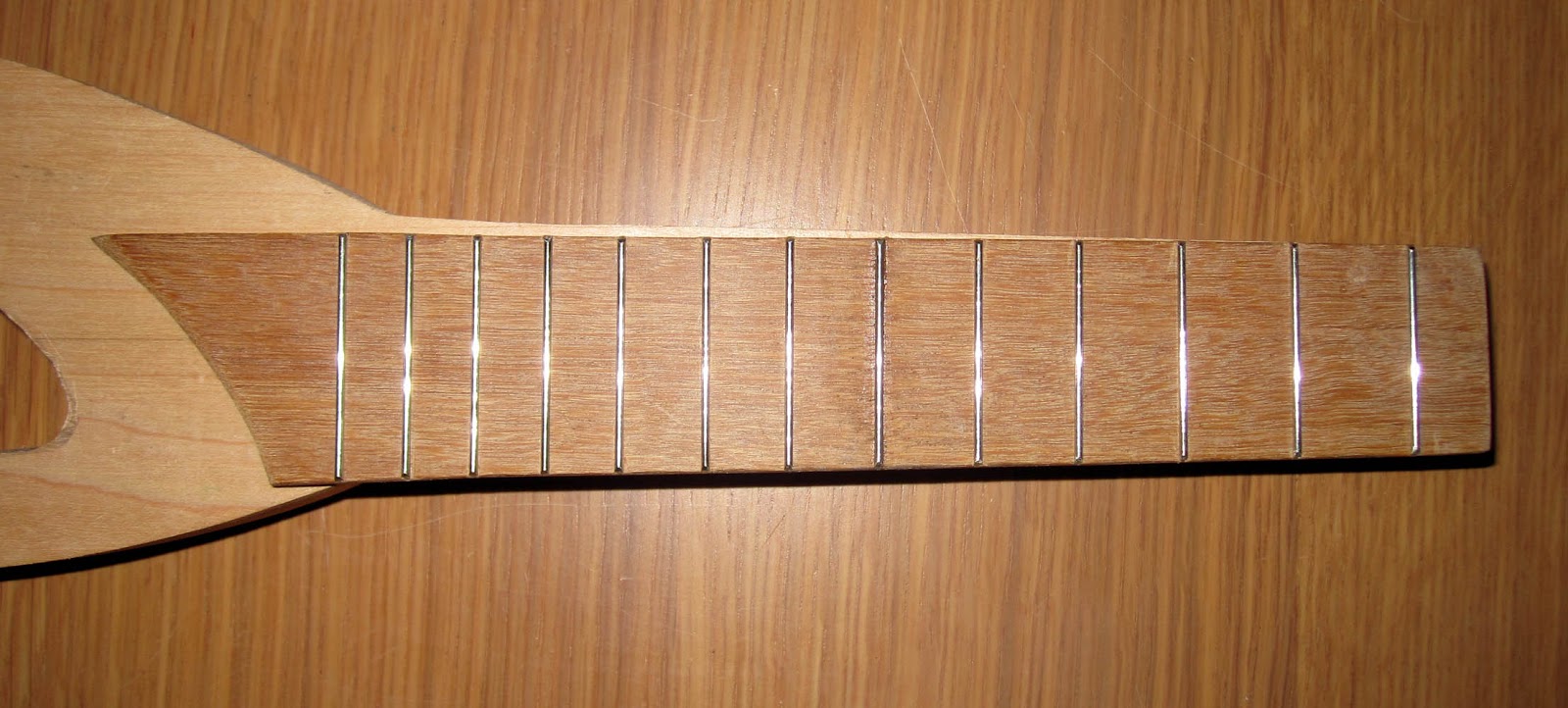 Here you can see that I’ve cut the slots for the frets and drilled the holes