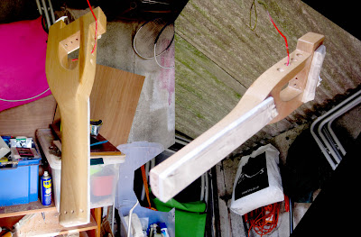 | I strung up the uke in the garage and gave it three coats of a clear lacquer. Look at the mess in my garage! It just depresses me. Keep your eyes on the ukulele… |